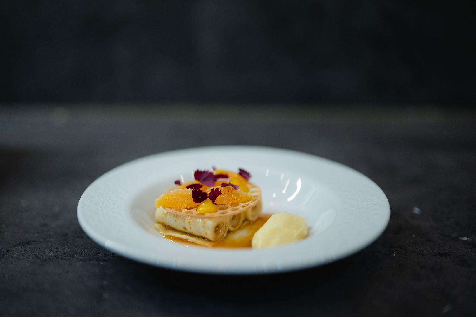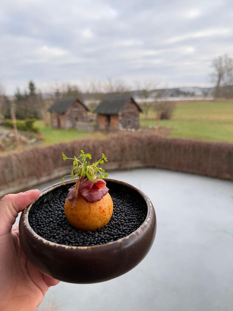 Filet ze pstruha, pečená zelenina na ohni, koprové velouté, koprový olej, kaviár ze pstruha |