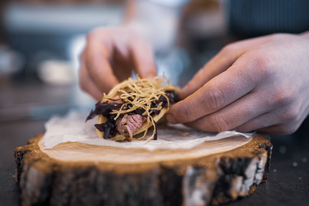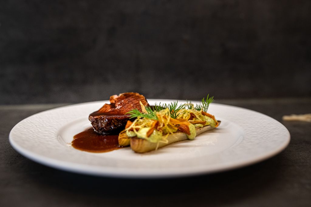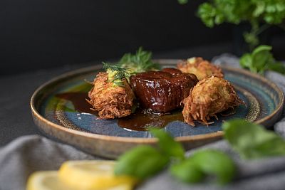 | Konfitované kachní stehno, červené dušené zelí, bramborové šišky se sušenými švestkami, škvarky | 389,- |